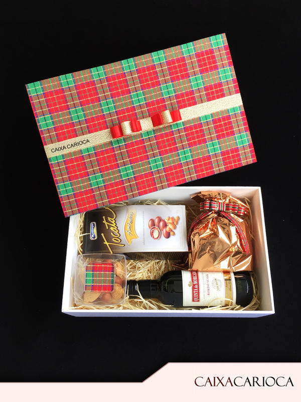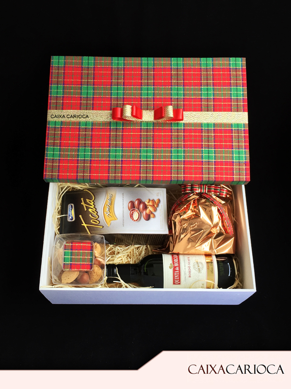 Caixa Personalizada + Mini Panetone 80g + Mini Vinho 245ml + Amêndoas confeitadas com chocolate + Castanhas + Avelã
